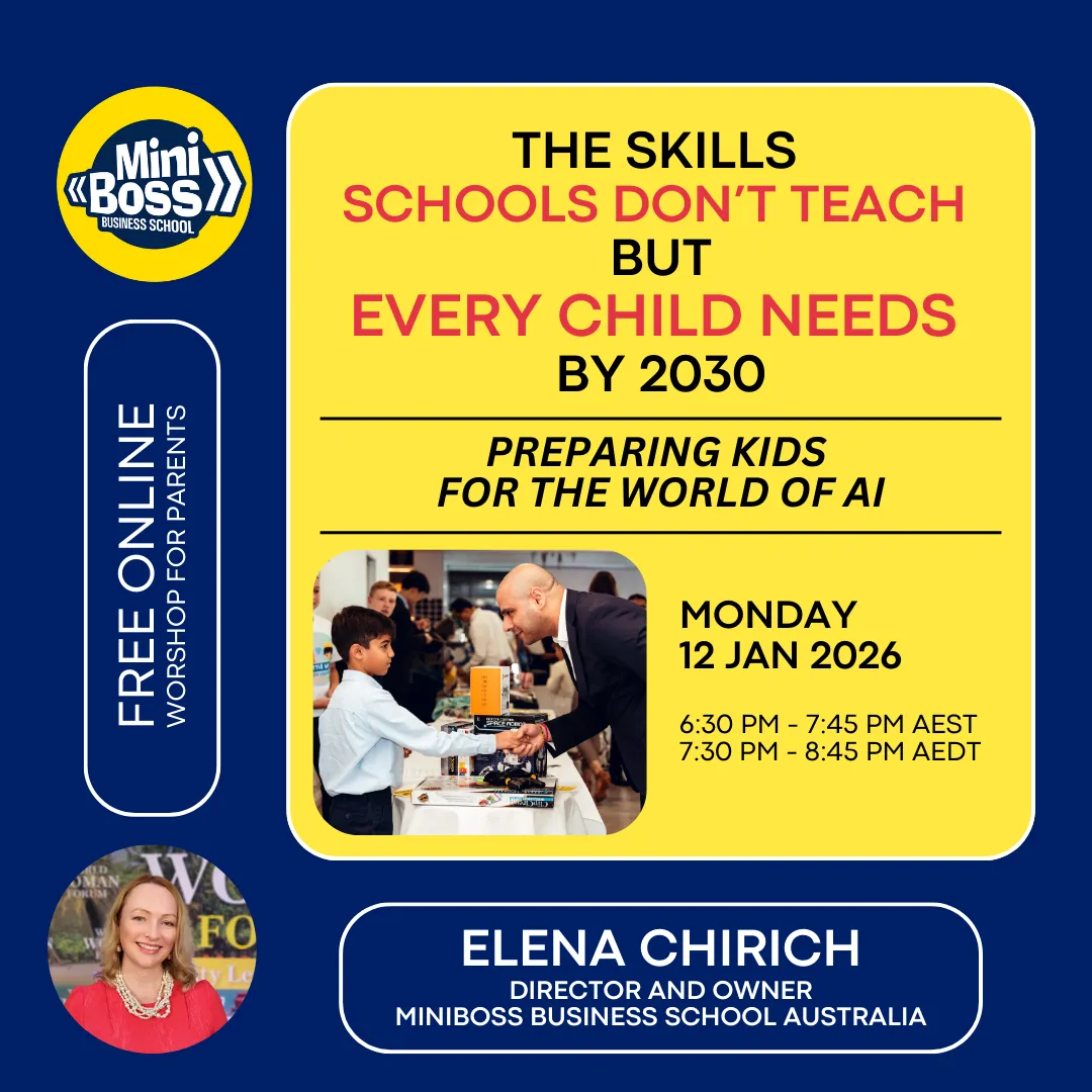 Elena Chirich is the Director and Owner of MiniBoss Business School Australia. She holds 2 Master’s degrees and a PhD, with over 20 years of experience transforming medium, large, and government organisations across multiple industries, including HP, Virgin Australia, KPMG, and Deloitte. Today, she applies that expertise to developing confident, capable kids aged 6–17 through real-world entrepreneurship and long-term success mindset and skill development.